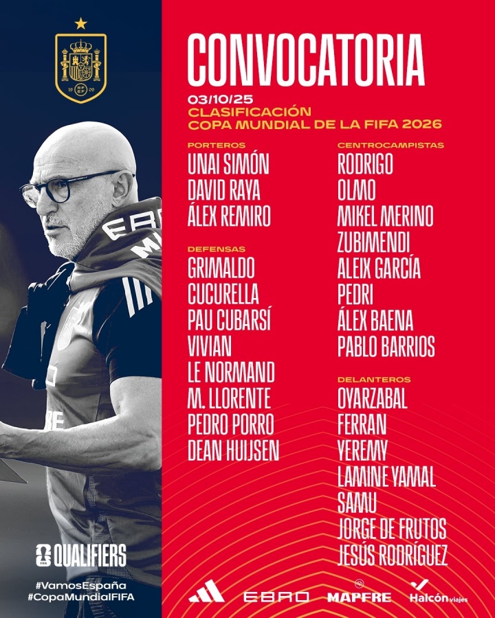 10月03日讯 西班牙队官方公布了10月份出征世预赛的球员大名单,亚马尔、佩德里等巴萨球员入选。